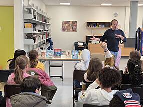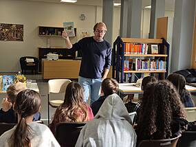 Knut Krüger hatte sichtbar Spaß, das Zwergmammut und seine Laute am „Einstein“ lebendig werden zu lassen. Auch nach der Lesung stellte er sich den Fragen der Fünftklässler:innen: Ob er lieber übersetze oder schreibe? Wie viele Bücher er bereits verkauft habe als Autor? Wie viel er verdiene und ob er gar schon Millionär geworden sei durch seine Bücher? Letzteres musste Krüger verneinen, aber „Nur mal schnell das Mammut retten“ war immerhin so erfolgreich, dass der Verlag nach Fortsetzungen verlangte. Mittlerweile ist deshalb eine vierteilige Reihe der „Nur mal schnell“-Geschichten entstanden. Natürlich forderte das junge Publikum auch eine Probe seiner Fremdsprachenkenntnisse, die Krüger gerne auf Norwegisch lieferte. Und bei aller Fantasie und Spaß, die in seinen Büchern für junge Leser:innen einfließen, verriet Krüger auch, dass es das Zwergmammut tatsächlich gegeben hat: Vor rund 740.000 Jahren lebte die kleinste bekannte Mammut-Art auf Kreta und wirkt rekonstruiert tatsächlich nicht viel größer als ein Hund.