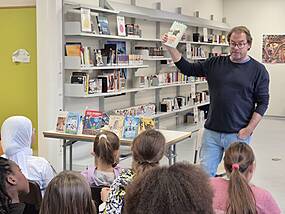 Am Freitagvormittag las Krüger nun aus seinem erfolgreichsten Buch „Nur mal schnell das Mammut retten“ und band dabei die Fünftklässler:innen mit Fragen geschickt in seinen Vortrag ein. Denn vielen ging (und geht) es, wie der Hauptfigur Henry, der sich sehnlich einen Hund wünscht – und auf Abwehr und Unverständnis bei den Eltern trifft. Unverhofft erfüllt sich für ihn zwar nicht der Wunsch nach einem Hund, dafür kracht er mit seinem Fahrrad in ein Zwergmammut und so beginnt ein spannendes Abenteuer für Henry und seine Freunde. Denn verstecken lässt sich das zottelige Fundtier nur mit Mühe vor den Eltern und es braucht natürlich auch die passende Zuwendung.