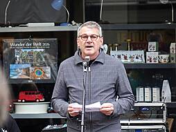Für einen würdevollen Rahmen sorgte an diesem Morgen das Violinen-Spiel von Lena Stalinski (Jahrgangsstufe 1) und der „Einstein“-Absolventin Lea Balzar, die die Gedenkveranstaltung mit drei Stück umrahmten. Nach der Begrüßung der anwesenden Gäste durch Pastoralreferent Martin Kramer und der Ansprache von Oberbürgermeister Wolfram Britz stellte die Zeitzeugen-AG in einer szenischen Lesung, begleitet von historischen Fotos und eingespielten O-Tönen, das Schicksal der Familie Gradwohl dar. Über ein Vierteljahrhundert betrieb der Kaufmann Sigmund Gradwohl ein angesehenes Herrenbekleidungsgeschäft, an das sich zahlreiche Zeitzeuginnen und Zeitzeugen noch Jahrzehnte später erinnern konnten. Sogleich nach dem Beginn der NS-Herrschaft wurde die Familie Gradwohl, die durch ihre elsässische Herkunft die französische Staatsbürgerschaft besaß, drangsaliert. Eine Hausdurchsuchung und der Entzug von Pässen sollten die Familie einschüchtern. Sigmund Gradwohl flüchtete nach Straßburg, seine Frau und sein Sohn sowie eine Cousine versuchten das Geschäft trotz aller Schwierigkeiten weiter zu betreiben. Auch der reichsweite Boykott jüdischer Geschäfte am 1. April 1933 traf die Gradwohls. SA-Posten zogen vor dem Eingang des Hauses auf und pöbelten alle Kunden an, die es wagten das Geschäft zu betreten.