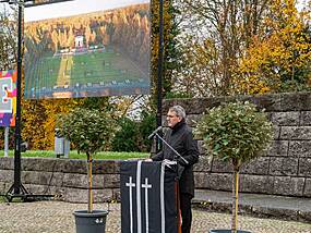 Bei ihren Projekten hat die Stadt Kehl die Zeitzeugen-AG unterstützt und auch mit der Kamera bei ihrer Arbeit begleitet. Die entstanden Filme wurden beim Volkstrauertag auf einer Videoleinwand gezeigt: Hier können die Aufnahmen zur Graffitigestaltung und zu den Gesprächen mit Hinterbliebenen angesehen werde. Die Ansprache zur Gedenkveranstaltung hat Oberbürgermeister Wolfram Britz gehalten. Musikalisch umrahmt wurde die Gedenkfeier zum Volkstrauertag von Café Flore mit den Musikern Gunnar Sommer und Jean-Michel Eschbach. Mehr könnt ihr in dem Artikel der Stadt Kehl darüber erfahren.