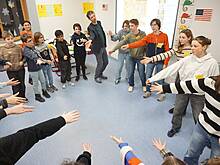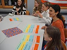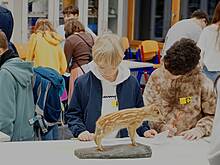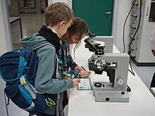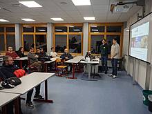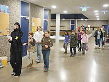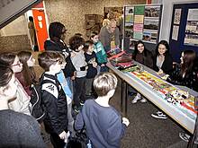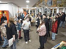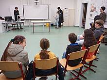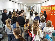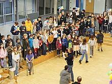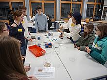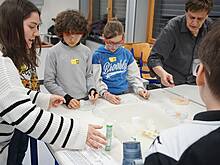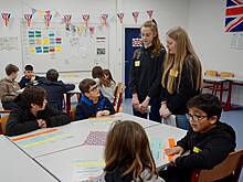 Die Viertklässler:innen starteten kurz darauf mit ihrer Entdeckungstour durch das große Schulgebäude. Ihre Begleiter waren ältere Schüler:innen, die auch im neuen Schuljahr den Fünftklässler:innen im Schulalltag unterstützend zur Seite stehen werden. Gemeinsam mit diesen Patinnen und Paten ging es gruppenweise zu unterschiedlichen Stationen: In allen Atrien und den ersten beiden Stockwerken (und in der Turnhalle) warteten Fächer oder AGs, die sich spielerisch und kreativ vorstellten. So konnte in den Naturwissenschaften mit Teebeutelraketen oder „fliegenden Filmdosen“ experimentiert werden. In Biologie galt es bei einem Quiz, z.B. die Beine eines Mehlwurms zu zählen und das Fell eines Pinguins von einer Bergziege zu unterscheiden. In der Mathematik ging es um Zahlentricks und in Englisch wurde mit vollem Körpereinsatz gesungen und Small-Talk geübt. Auch AGs präsentierten sich wie z.B. der Leseclub, die Robotik- und Modellbahn-AG oder die Schulsanitäter.