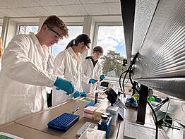 Nun ging es endlich ins Labor! Jetzt konnte der Leistungskurs seine praktischen Fähigkeiten unter Beweis stellen: hochmotiviert wurde pipettiert, zentrifugiert, extrahiert, geschüttelt und gerührt ...und so schafften wir es, die Elektrophoresekammern noch vor der Mittagspause zu starten.