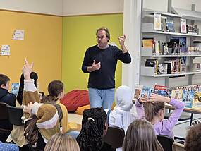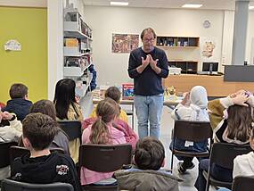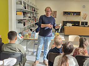Knut Krüger hatte sichtbar Spaß, das Zwergmammut und seine Laute am „Einstein“ lebendig werden zu lassen. Auch nach der Lesung stellte er sich den Fragen der Fünftklässler:innen: Ob er lieber übersetze oder schreibe? Wie viele Bücher er bereits verkauft habe als Autor? Wie viel er verdiene und ob er gar schon Millionär geworden sei durch seine Bücher? Letzteres musste Krüger verneinen, aber „Nur mal schnell das Mammut retten“ war immerhin so erfolgreich, dass der Verlag nach Fortsetzungen verlangte. Mittlerweile ist deshalb eine vierteilige Reihe der „Nur mal schnell“-Geschichten entstanden. Natürlich forderte das junge Publikum auch eine Probe seiner Fremdsprachenkenntnisse, die Krüger gerne auf Norwegisch lieferte. Und bei aller Fantasie und Spaß, die in seinen Büchern für junge Leser:innen einfließen, verriet Krüger auch, dass es das Zwergmammut tatsächlich gegeben hat: Vor rund 740.000 Jahren lebte die kleinste bekannte Mammut-Art auf Kreta und wirkt rekonstruiert tatsächlich nicht viel größer als ein Hund.