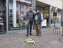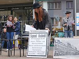 Für einen würdevollen Rahmen sorgte an diesem Morgen das Violinen-Spiel von Lena Stalinski (Jahrgangsstufe 1) und der „Einstein“-Absolventin Lea Balzar, die die Gedenkveranstaltung mit drei Stück umrahmten. Nach der Begrüßung der anwesenden Gäste durch Pastoralreferent Martin Kramer und der Ansprache von Oberbürgermeister Wolfram Britz stellte die Zeitzeugen-AG in einer szenischen Lesung, begleitet von historischen Fotos und eingespielten O-Tönen, das Schicksal der Familie Gradwohl dar. Über ein Vierteljahrhundert betrieb der Kaufmann Sigmund Gradwohl ein angesehenes Herrenbekleidungsgeschäft, an das sich zahlreiche Zeitzeuginnen und Zeitzeugen noch Jahrzehnte später erinnern konnten. Sogleich nach dem Beginn der NS-Herrschaft wurde die Familie Gradwohl, die durch ihre elsässische Herkunft die französische Staatsbürgerschaft besaß, drangsaliert. Eine Hausdurchsuchung und der Entzug von Pässen sollten die Familie einschüchtern. Sigmund Gradwohl flüchtete nach Straßburg, seine Frau und sein Sohn sowie eine Cousine versuchten das Geschäft trotz aller Schwierigkeiten weiter zu betreiben. Auch der reichsweite Boykott jüdischer Geschäfte am 1. April 1933 traf die Gradwohls. SA-Posten zogen vor dem Eingang des Hauses auf und pöbelten alle Kunden an, die es wagten das Geschäft zu betreten.