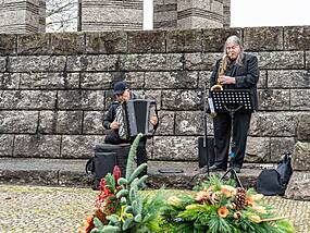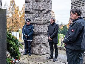 Bei ihren Projekten hat die Stadt Kehl die Zeitzeugen-AG unterstützt und auch mit der Kamera bei ihrer Arbeit begleitet. Die entstanden Filme wurden beim Volkstrauertag auf einer Videoleinwand gezeigt: Hier können die Aufnahmen zur Graffitigestaltung und zu den Gesprächen mit Hinterbliebenen angesehen werde. Die Ansprache zur Gedenkveranstaltung hat Oberbürgermeister Wolfram Britz gehalten. Musikalisch umrahmt wurde die Gedenkfeier zum Volkstrauertag von Café Flore mit den Musikern Gunnar Sommer und Jean-Michel Eschbach. Mehr könnt ihr in dem Artikel der Stadt Kehl darüber erfahren.